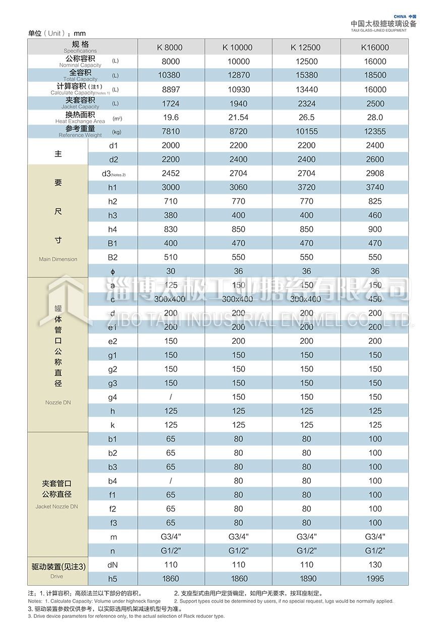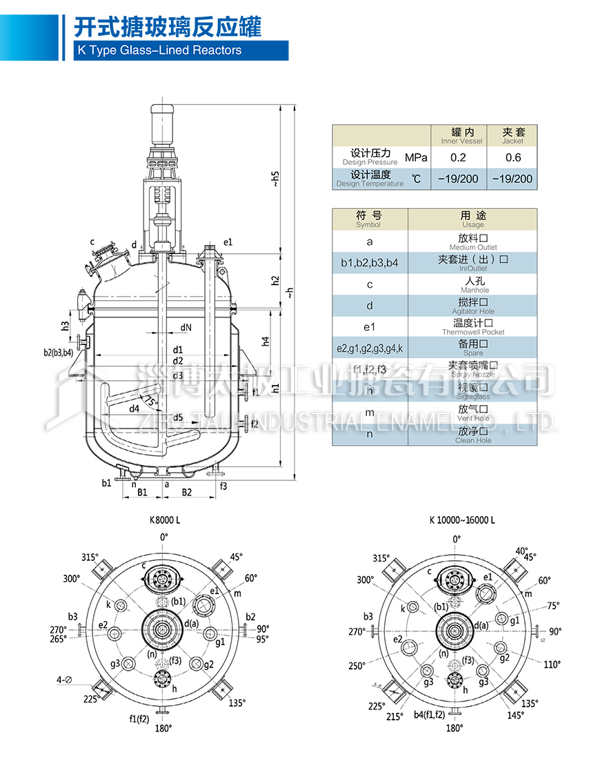 K8000L~K16000L開式搪玻璃反應(yīng)釜(搪瓷反應(yīng)釜)設(shè)計(jì)圖紙及相關(guān)參數(shù)如下所示: