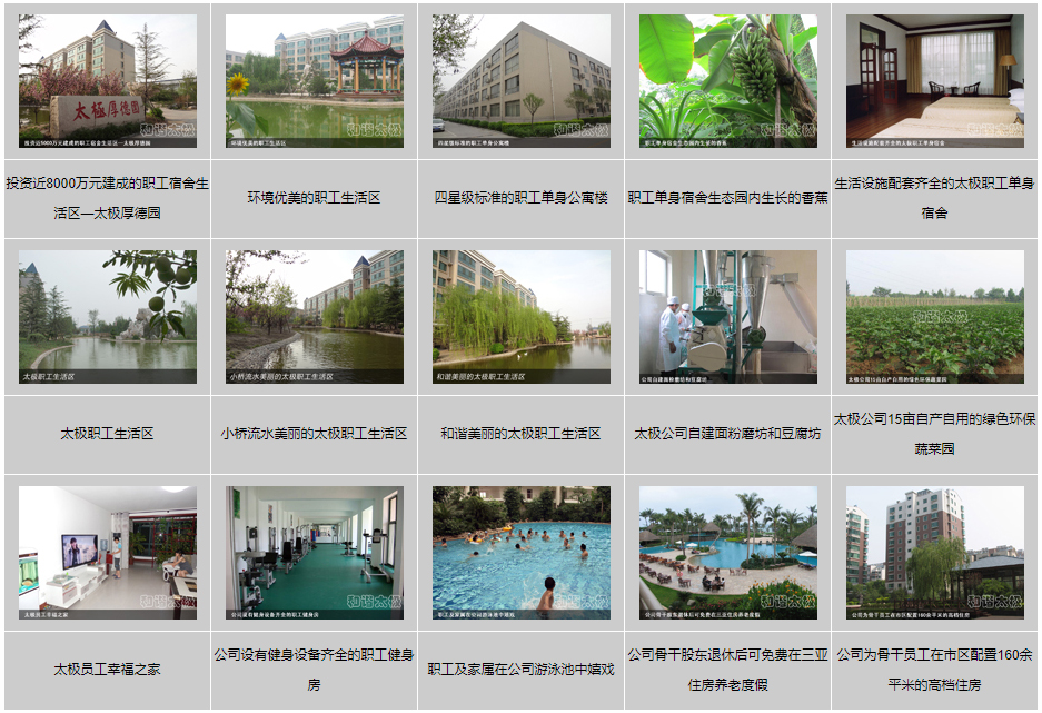在2008年,太極公司投資近8000萬元建成了職工公寓樓3座,戶外綠樹溪湖環(huán)繞,每戶面積170平米,統(tǒng)一配置60寸夏普電視等。所建成的職工單身公寓樓采用四星級標準,共176間房,人均戶面積50平米,統(tǒng)一配置電視、網(wǎng)絡(luò)、洗浴間、床柜、空調(diào)、暖氣、桌椅等。而且單身公寓內(nèi)設(shè)有3000余平方米的生態(tài)園林和高檔游泳池,一年四季綠樹茂盛常春。